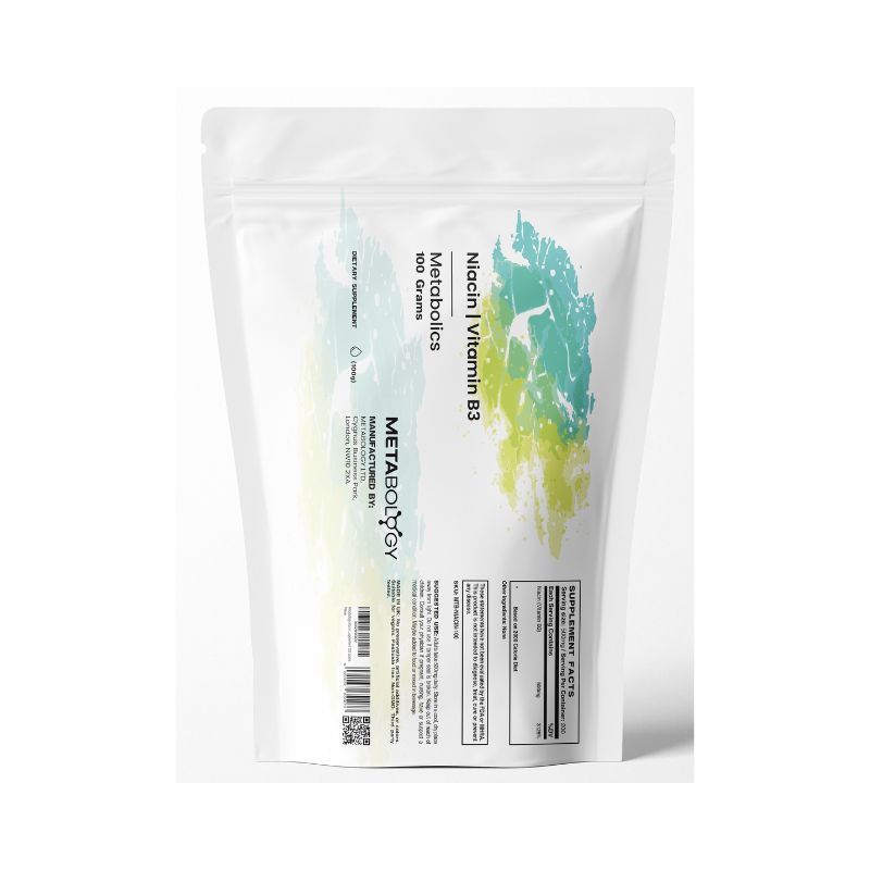 Metabology offers high-quality Niacin (Vitamin B3) powder in a quantity of 100g. Our Niacin (Vitamin B3) has been lab-tested and verified for both product purity and identity.